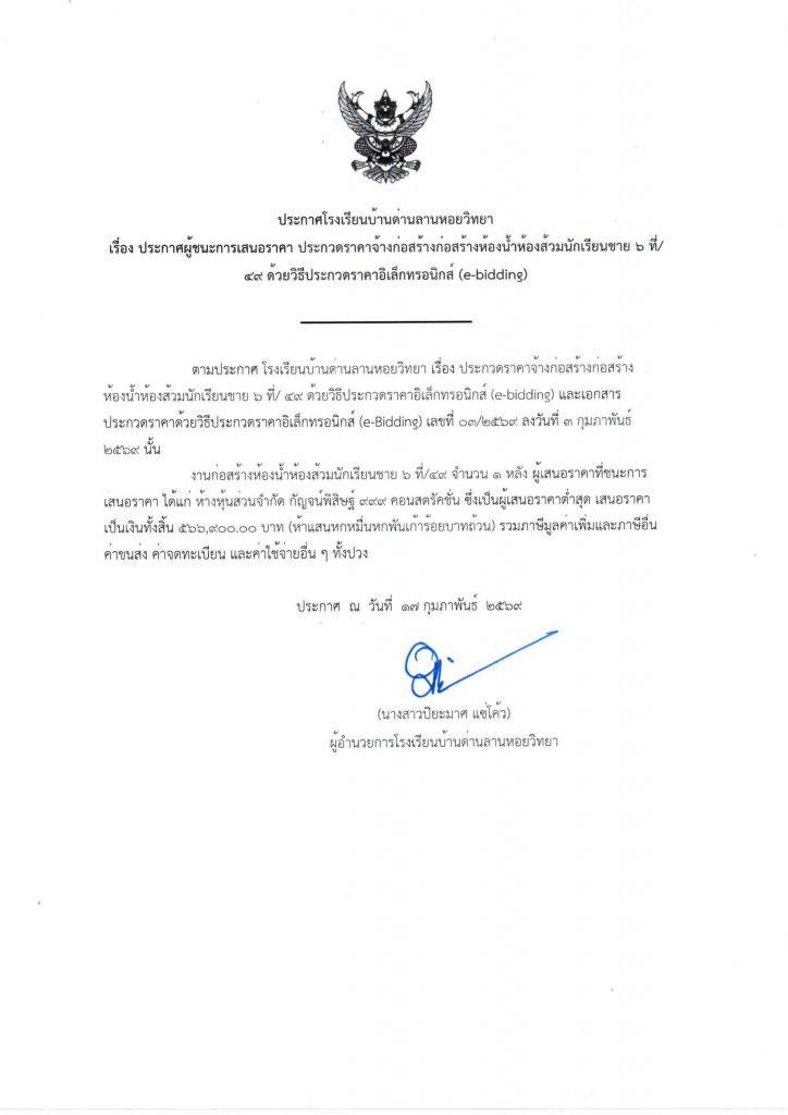 ประกาศผู้ชนะการเสนอราคา ประกวดราคาจ้างก่อสร้างก่อสร้างห้องน้ำห้องส้วมนักเรียนชาย 2 ที่/49 ด้วยวิธีประกวดราคาอิเล็กทรอนิกส์ (e-bidding) 2 สัปดาห์ ago ประกาศ 18 Views